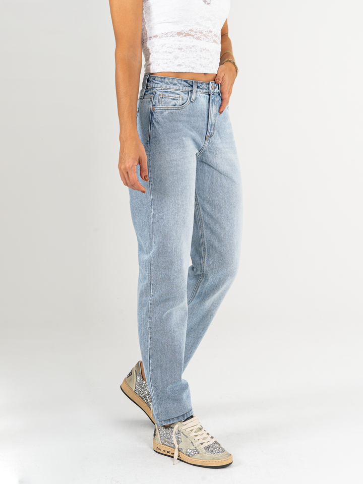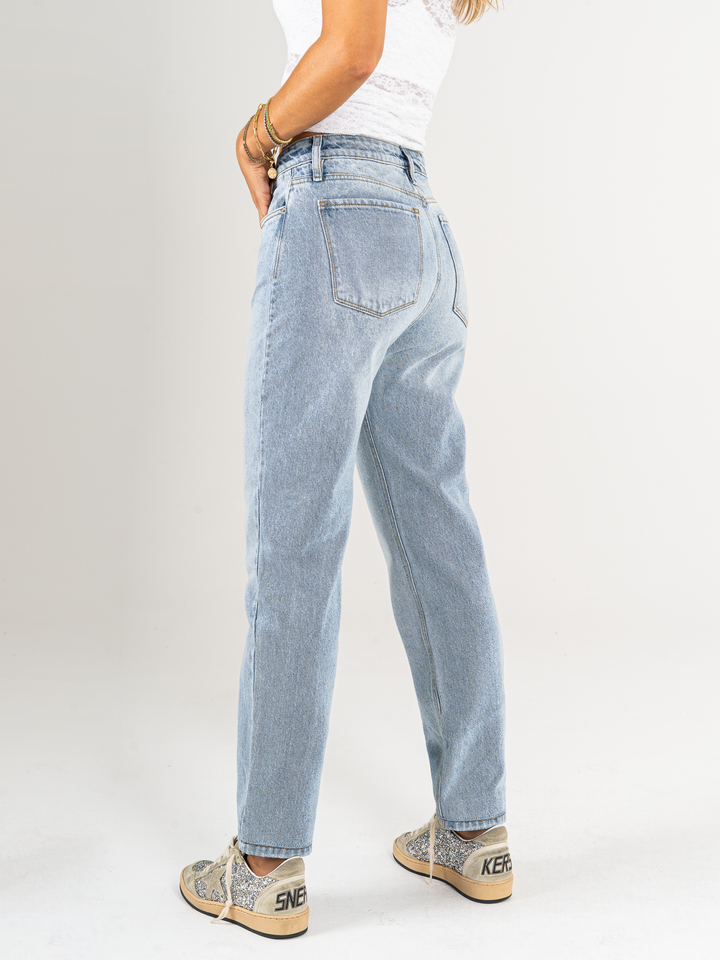 Jean Mom fit, rígido, tiro alto, tono azul claro, cintura ajustada pierna holgada, diseño cinco bolsillos.
