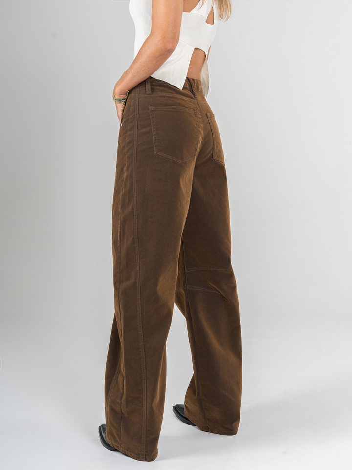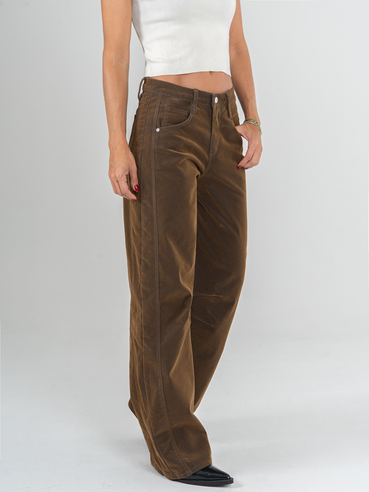Jean wide leg, confort, denim acabado terciopelo, tono café, tiro alto, diseño cinco bolsillos.