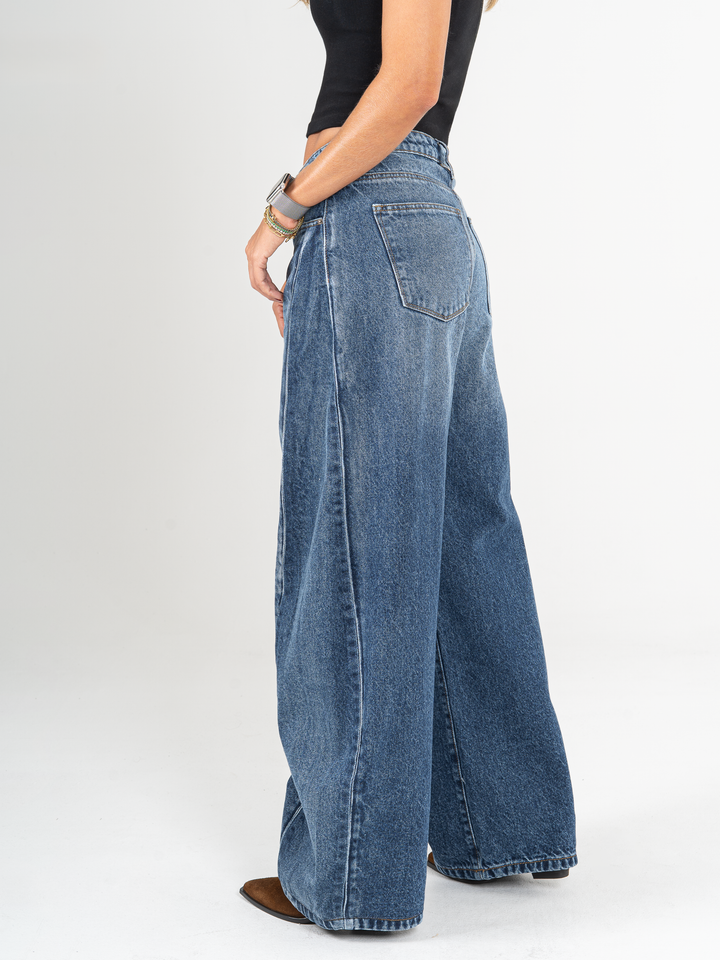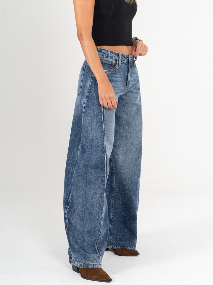 Jean wide leg, tiro medio, con cortes, rígido, tono azul medio, diseño 5 bolsillos, cintura ajustada y silueta amplia de pierna recta.