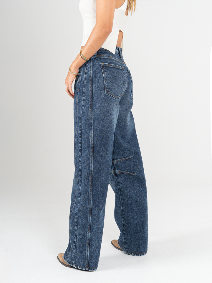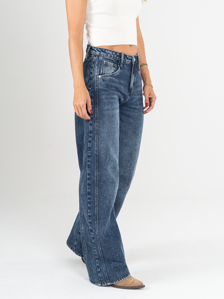 Jean wide leg, tiro alto, stretch, con cortes, tono azul oscuro, diseño 5 bolsillos, cintura ajustada y silueta amplia de pierna recta.
