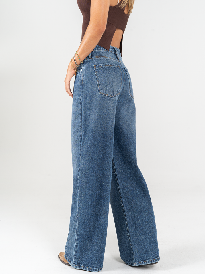 Ref: 066050 Jean wide leg, tiro medio, con cortes, rígido, tono azul medio.