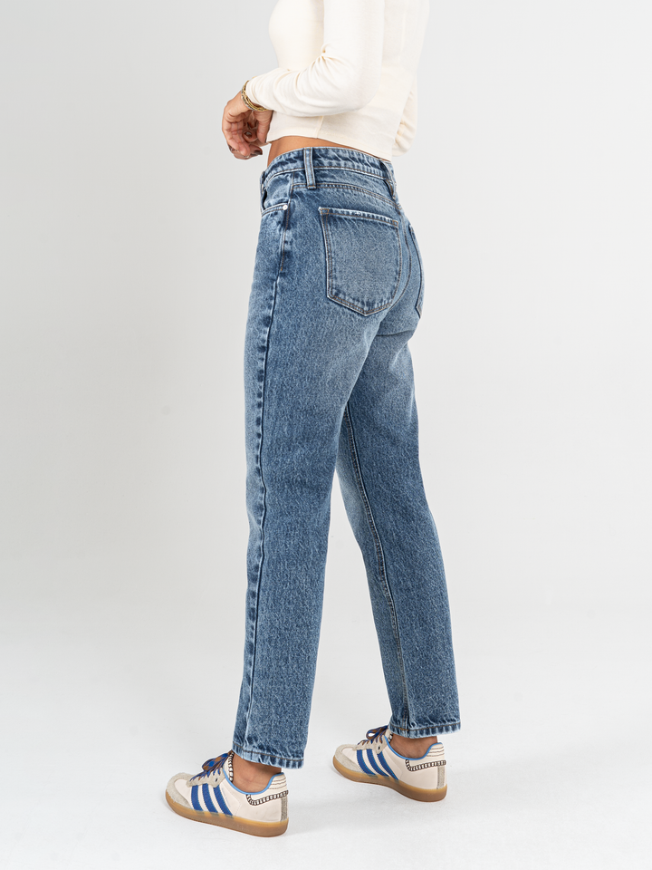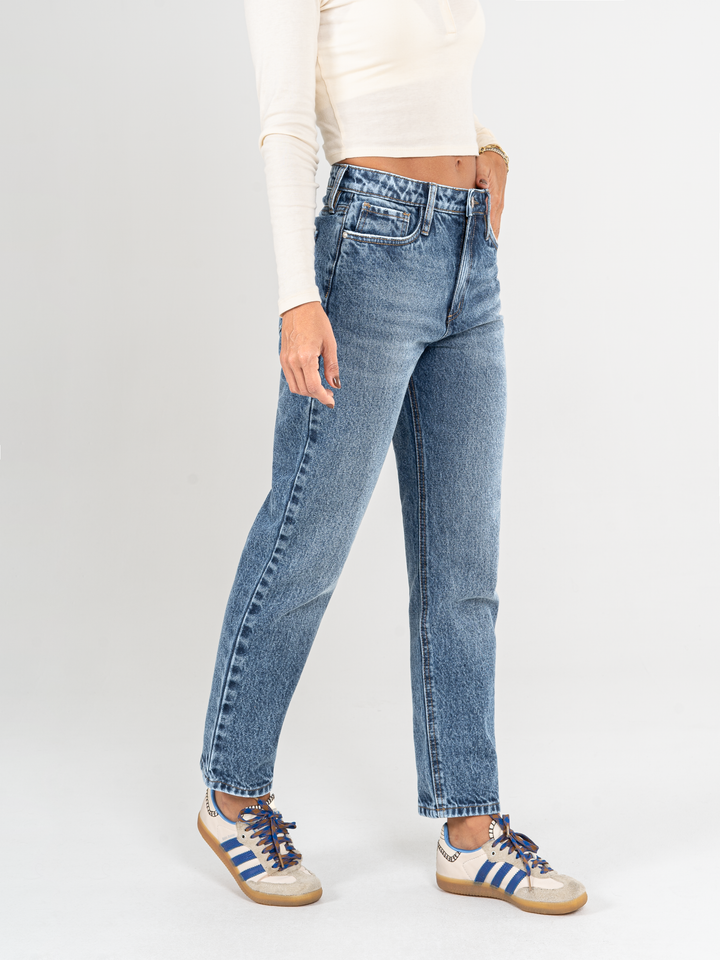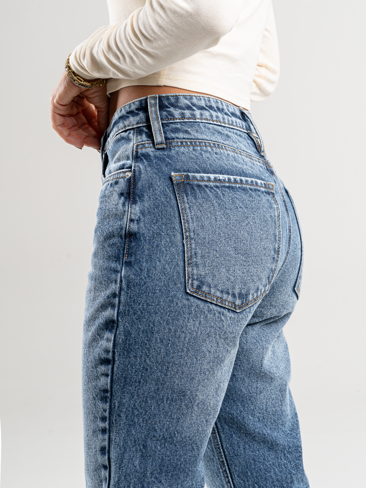 Jean Mom fit, rígido, tiro alto, tono azul medio, cintura ajustada pierna holgada, diseño cinco bolsillos.