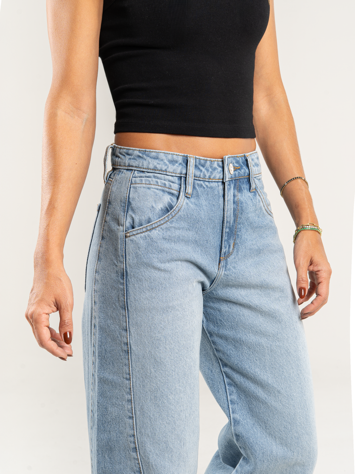 Jean mom flare, rígido, con cortes, tiro medio, azul medio, cintura ajustada, pierna holgada, diseño cinco bolsillos.