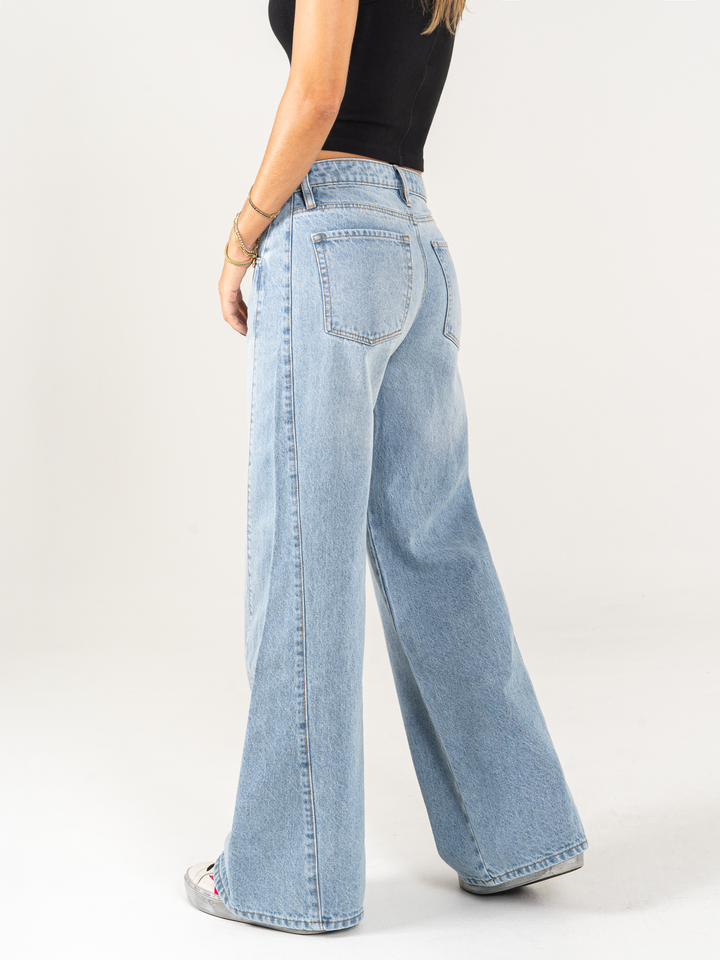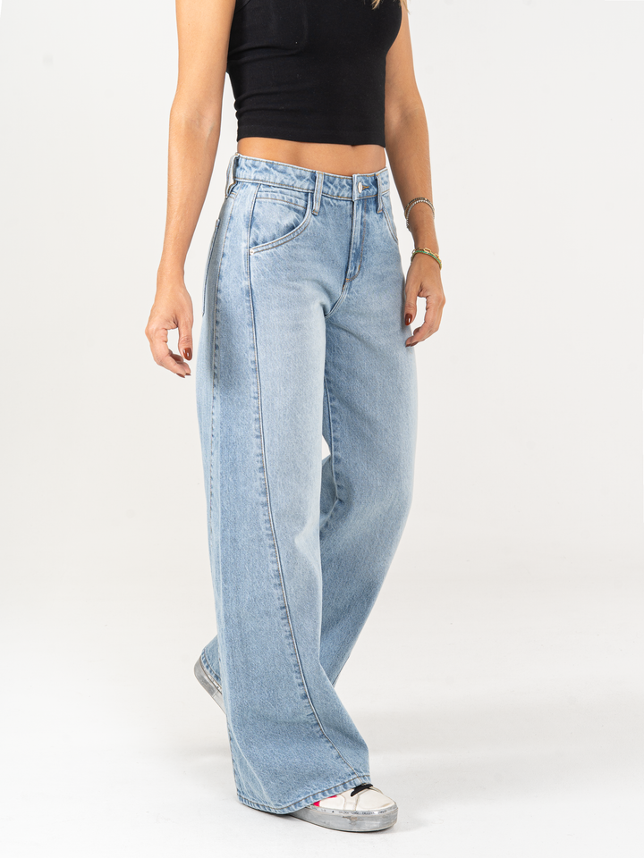 Ref: 065998 Jean wide leg, tiro alto, con cortes en costado, rígido, tono azul medio