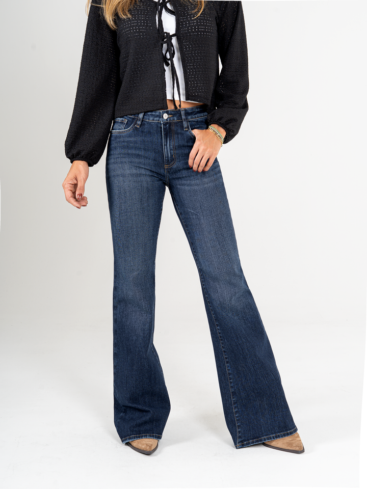 Jean flare stretch, bota ancha, tiro medio, tono azul oscuro, silueta ajustada, diseño cinco bolsillos.