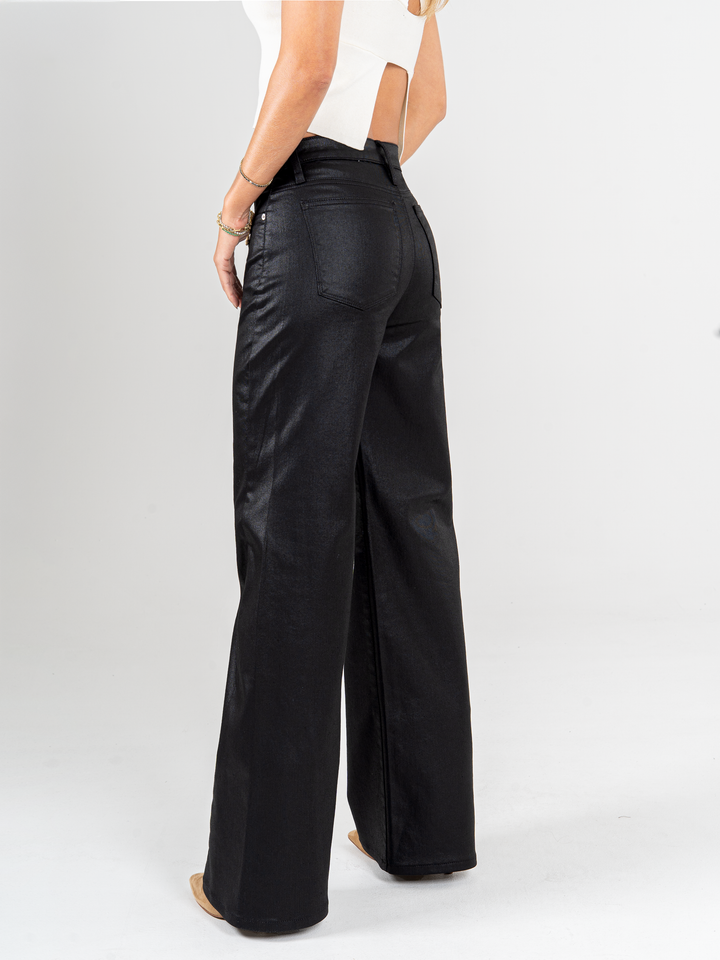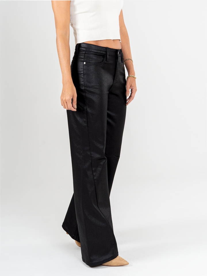 Pantalón wide leg stretch, tiro medio, con cortes, tono negro, efecto encerado, diseño cinco bolsillos.