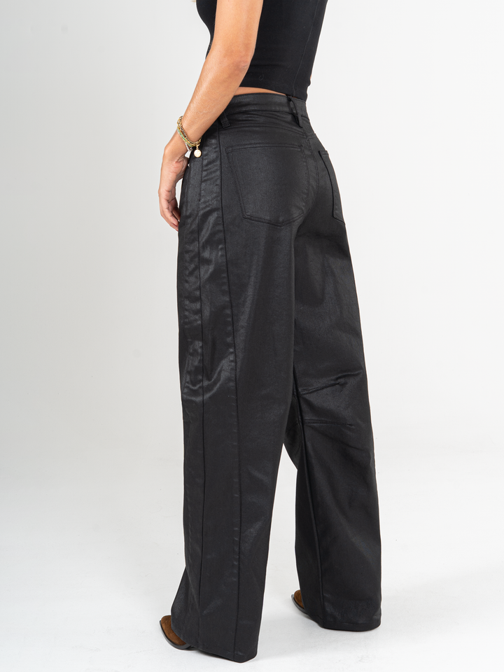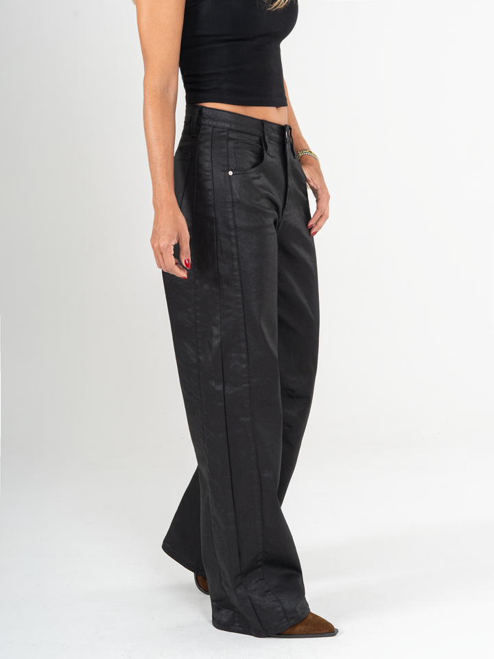 Pantalón wide leg stretch, tiro alto, con cortes en costado, tono negro, efecto encerado, diseño cinco bolsillos.