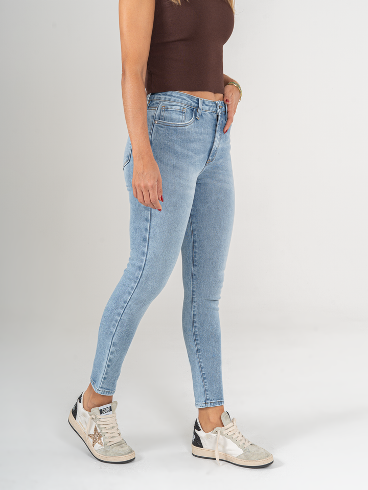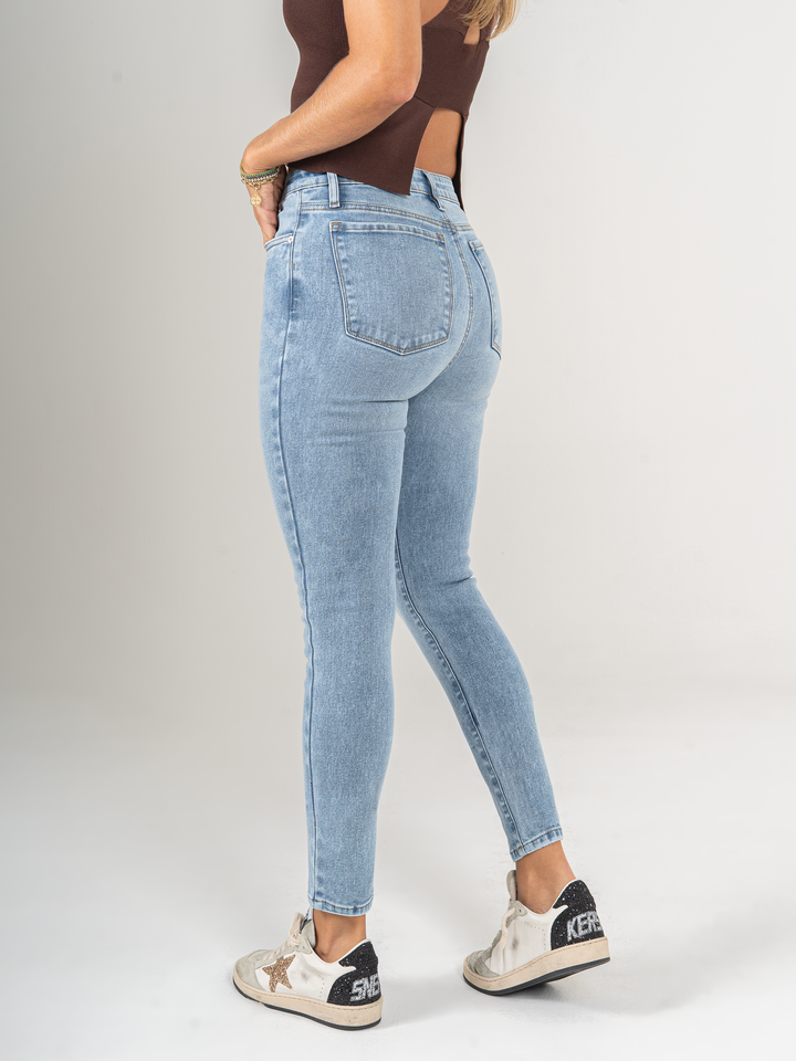 Jean Skinny stretch, tiro alto, tono azul claro, cintura ajustada y diseño cinco bolsillos.