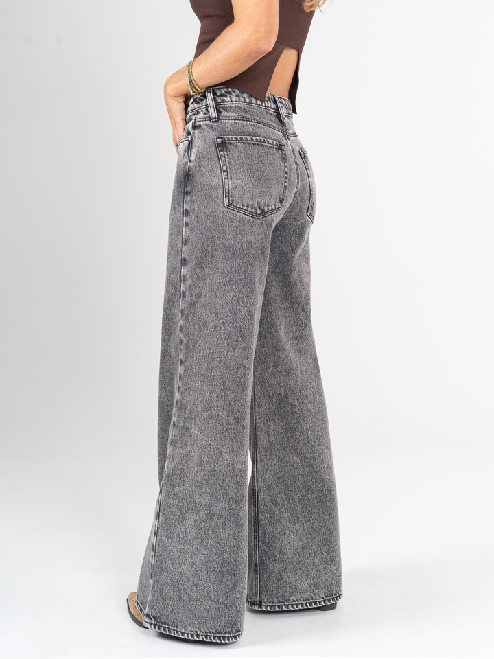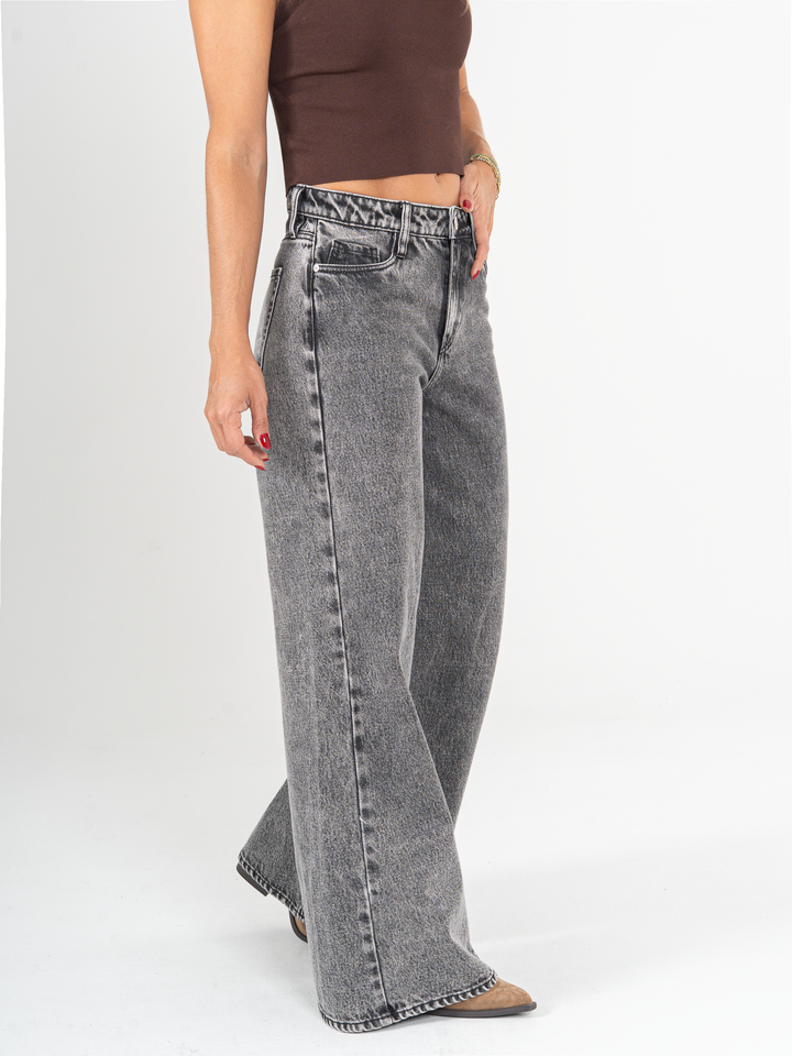 Jean palazzo, rígido, tiro alto, tono gris medio, cintura ajustada pierna holgada, diseño cinco bolsillos.
