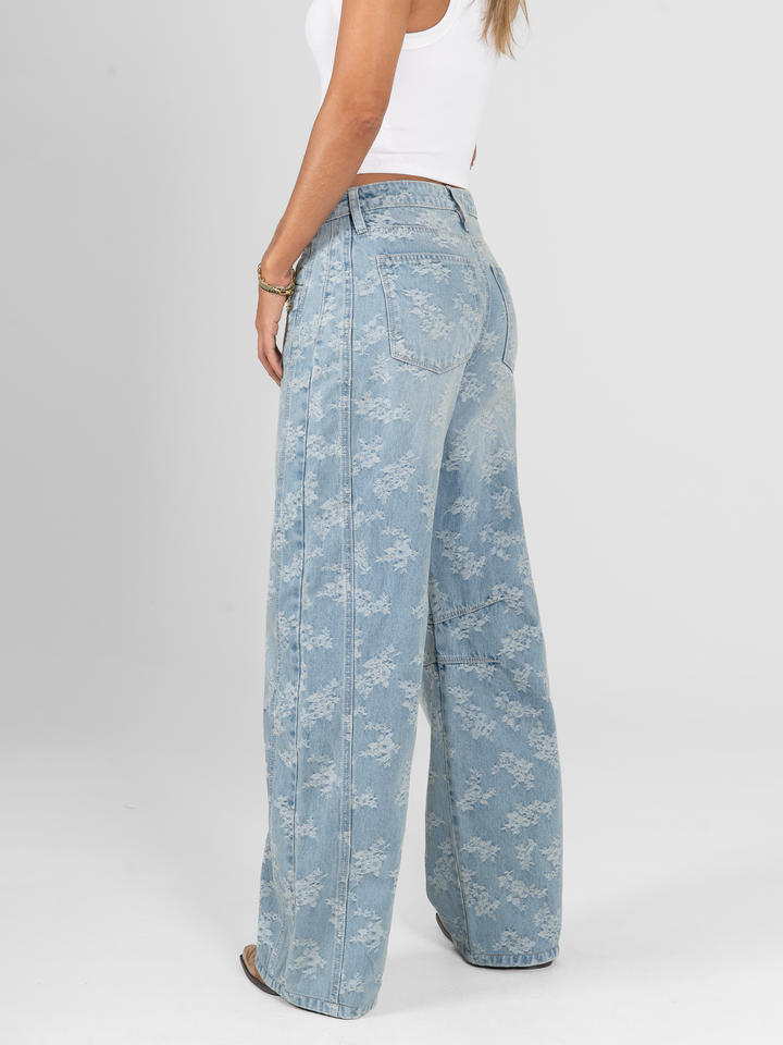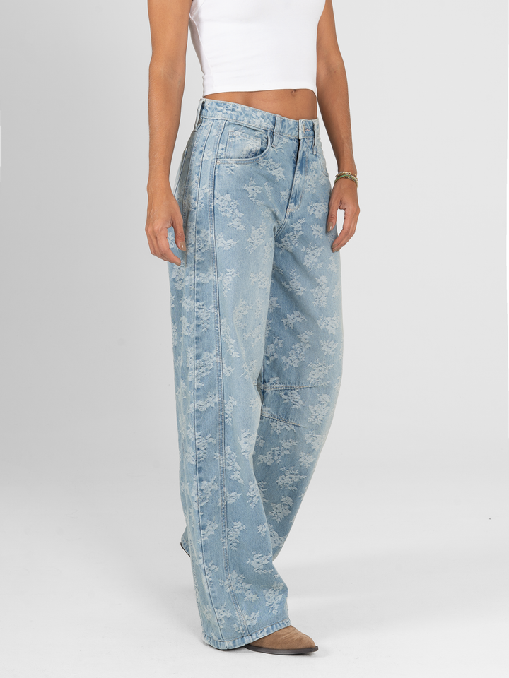 Jean wide leg, tiro alto, detalle de tela bordada, rígido, tono azul medio, diseño 5 bolsillos, cintura ajustada y silueta amplia de pierna recta.