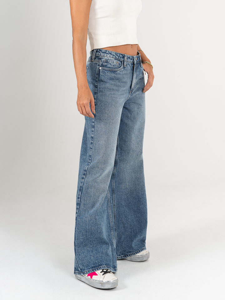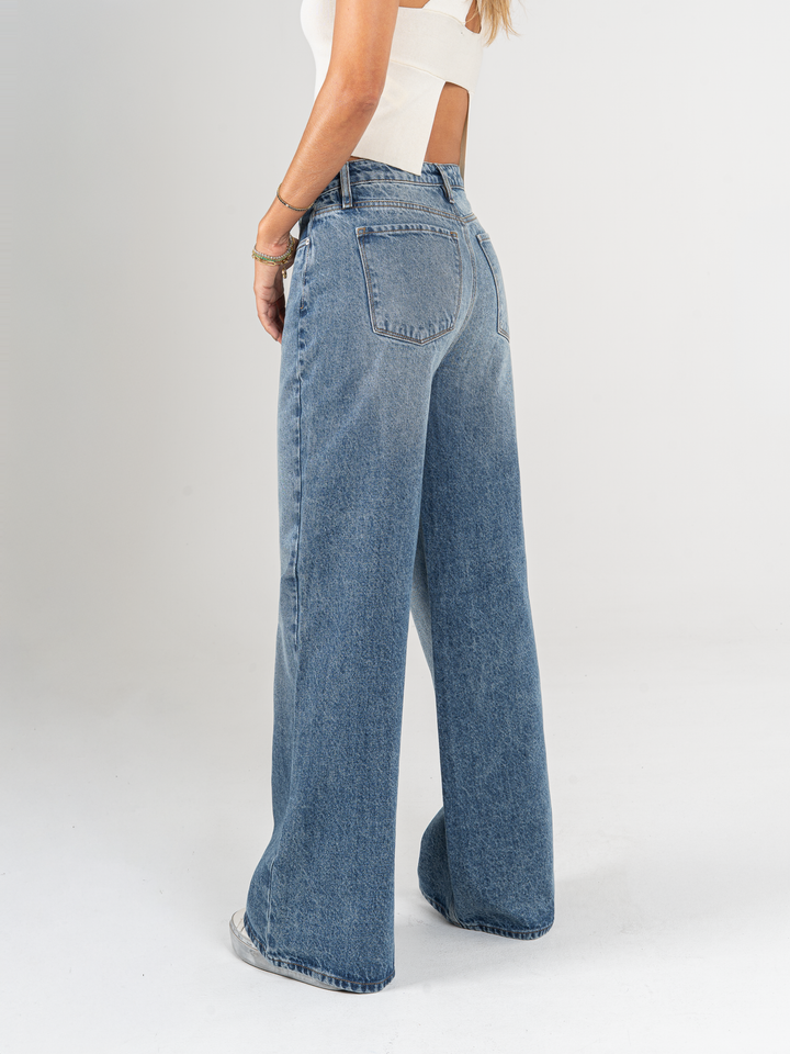 Jean palazzo, rígido, tiro alto, tono azul medio, diseño 5 bolsillos, cintura ajustada y pierna holgada.