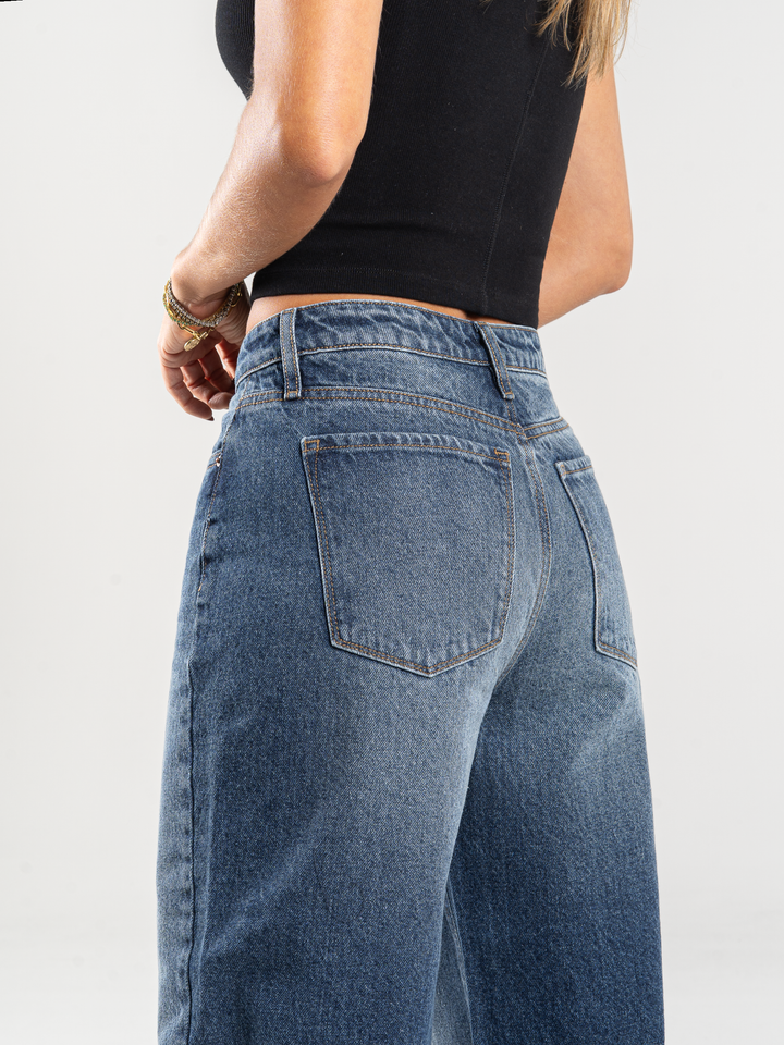 Ref: 065998 Jean wide leg, tiro alto, con cortes en costado, rígido, tono azul medio