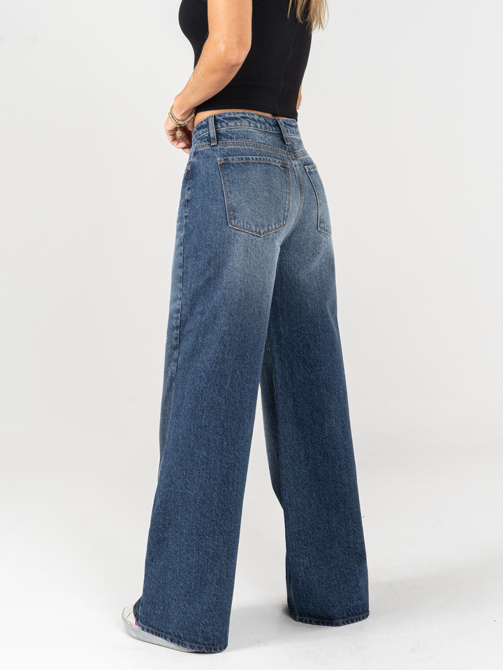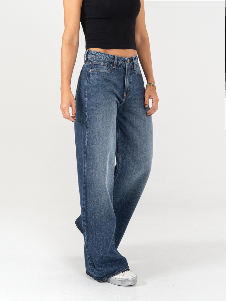 Jean palazzo, rígido, tiro alto, tono azul oscuro, cintura ajustada pierna holgada, diseño cinco bolsillos.