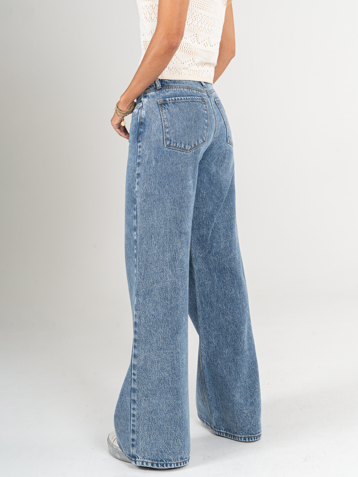 Jean palazzo, rígido, tiro alto, tono azul medio, cintura ajustada pierna holgada, diseño cinco bolsillos.