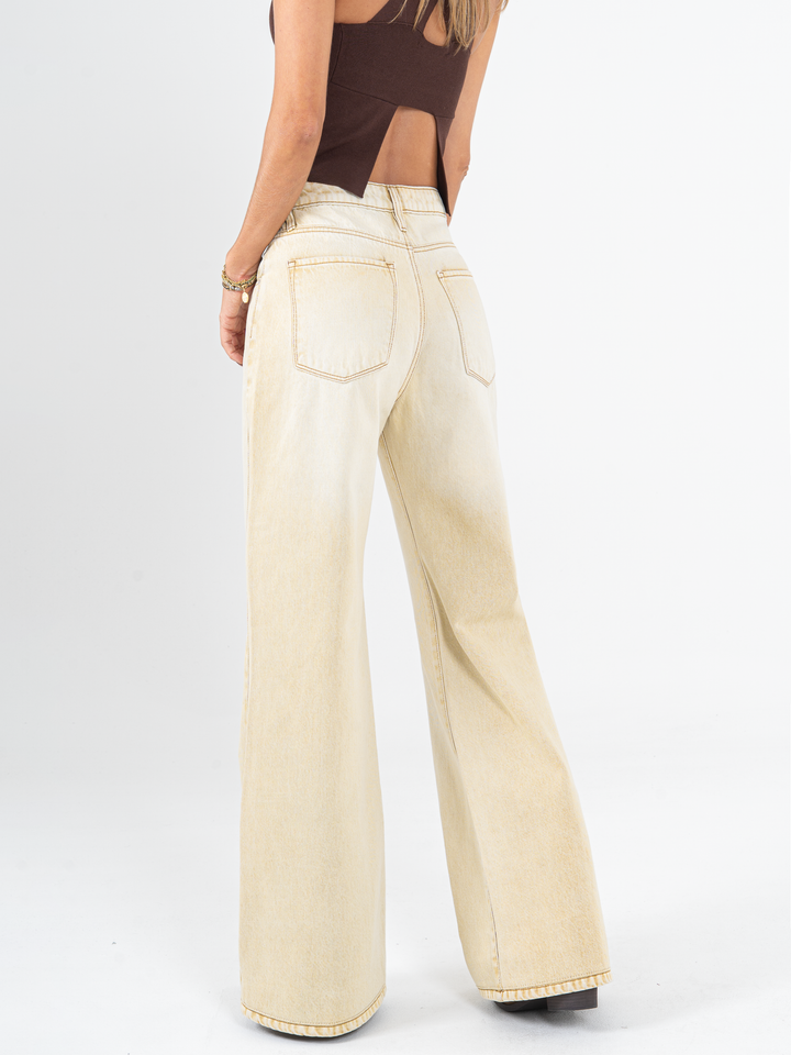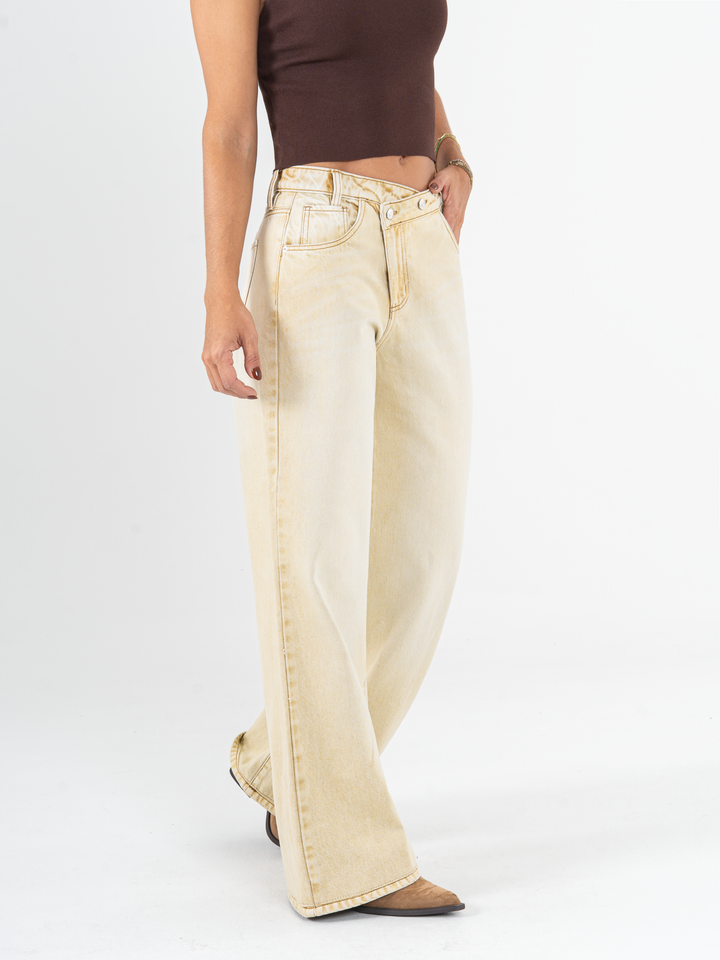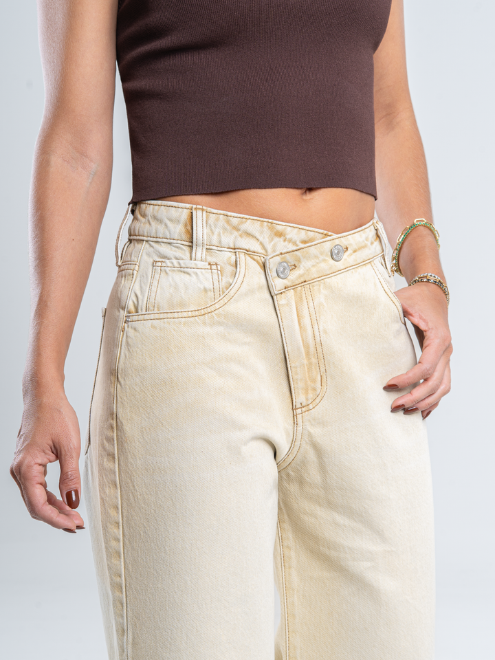 Jean mom flare, tiro alto, detalle en pretina, rígido, tono caqui con efecto desgastado,  diseño 5 bolsillos, silueta amplia.