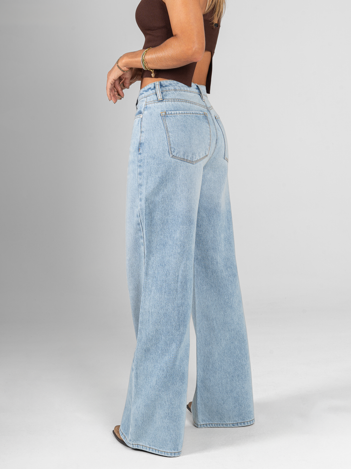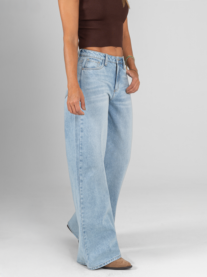 Jean palazzo, rígido, tiro medio, tono azul medio claro, cintura ajustada pierna holgada, diseño cinco bolsillos.