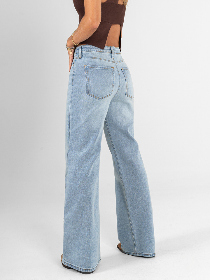 Jean flare stretch, bota ancha, tiro alto, tono azul medio claro, silueta ajustada, diseño cinco bolsillos.