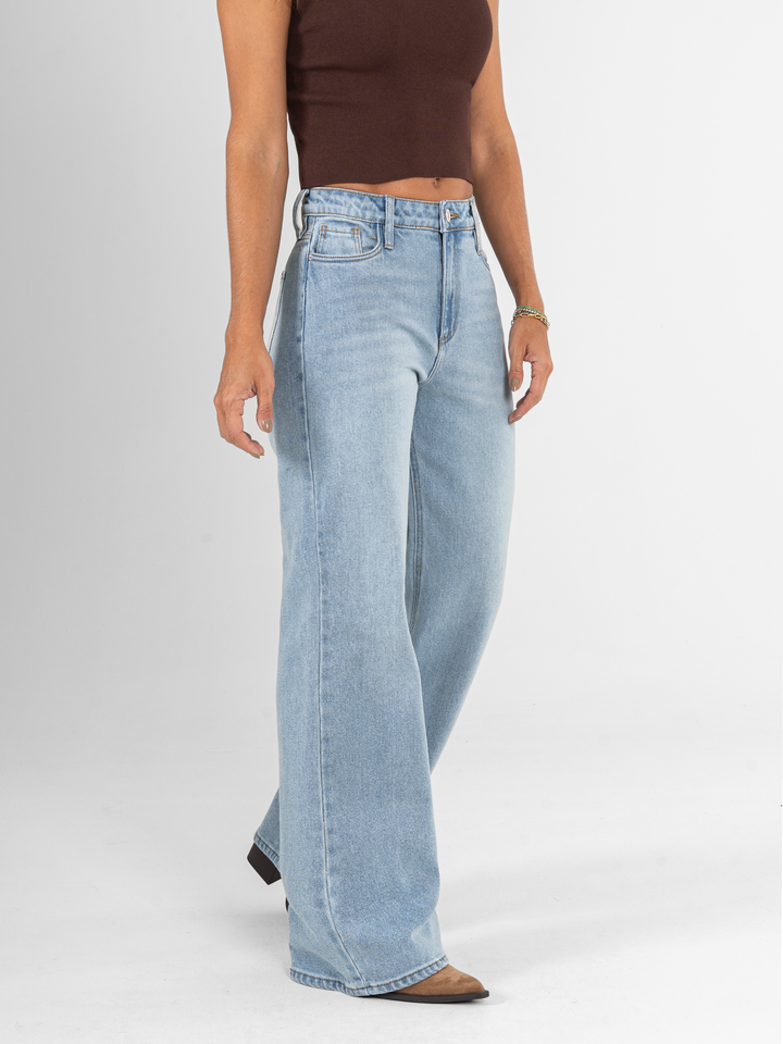 Ref: 066050 Jean wide leg, tiro medio, con cortes, rígido, tono azul medio.