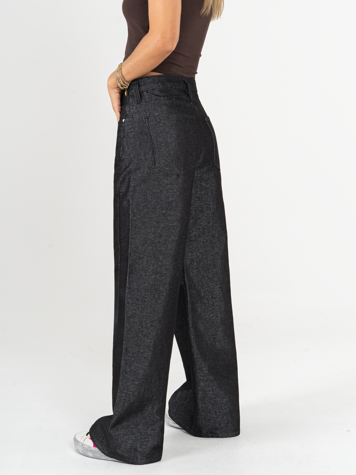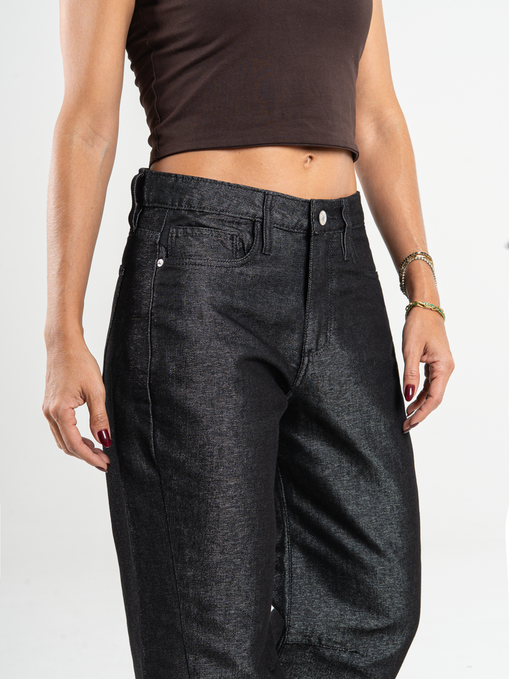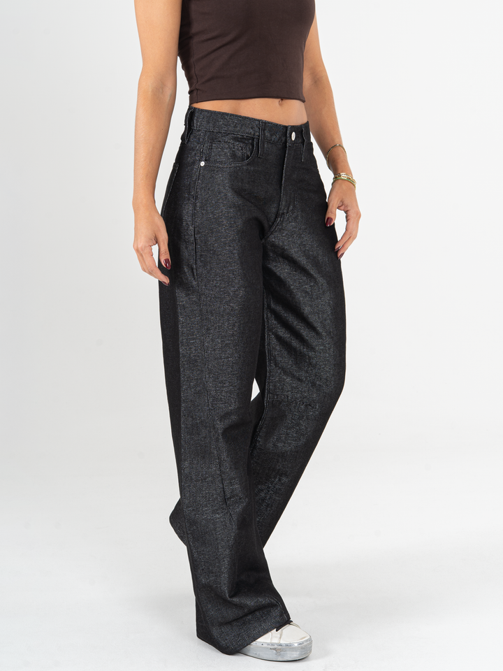 Jean wide leg, tiro medio, detalle de tela con brillo, rígido, tono negro, diseño 5 bolsillos, cintura ajustada y silueta amplia de pierna recta.