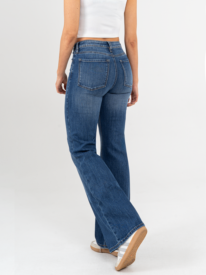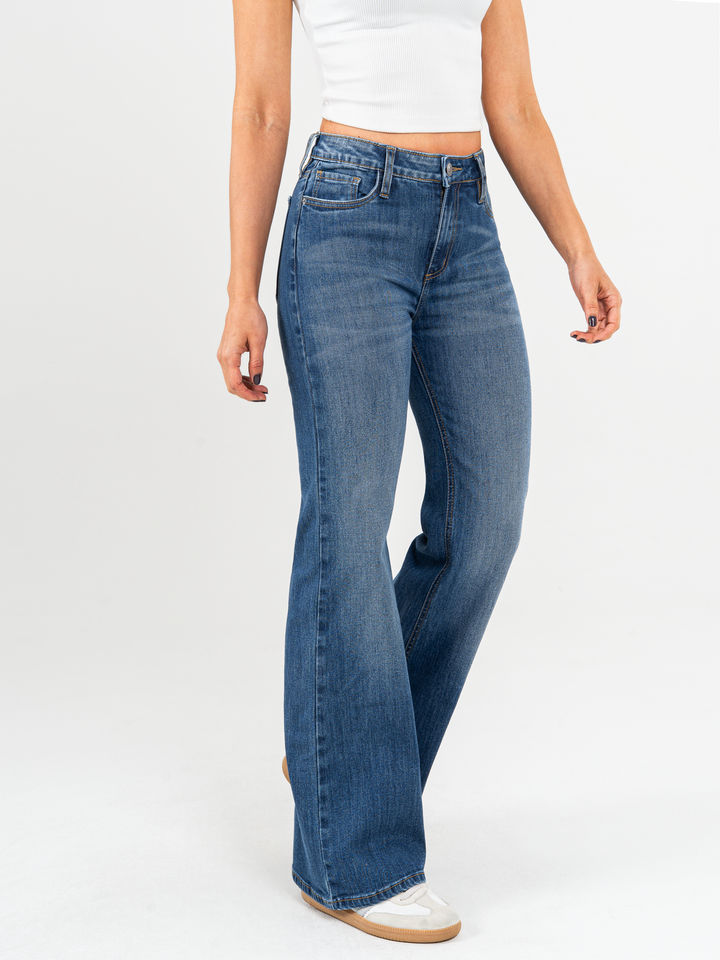 Jean flare stretch, bota ancha, tiro alto, tono azul medio, silueta ajustada, diseño cinco bolsillos.