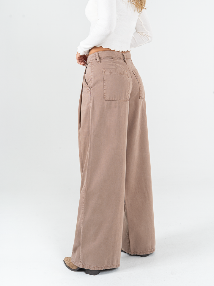 Pantalón palazzo, rígido, prenses, tiro alto, tono café, cintura ajustada pierna holgada, bolsillo diagonal.