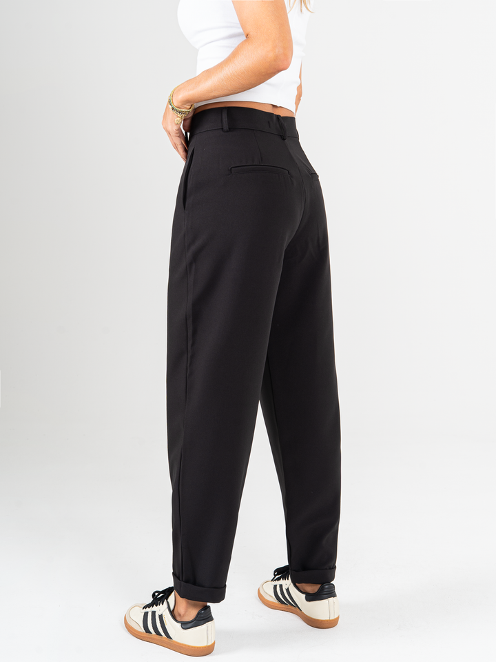 Pantalón slouchy, sin prense, tono negro, tejido plano liviano, tiro alto, bolsillo, silueta amplia.