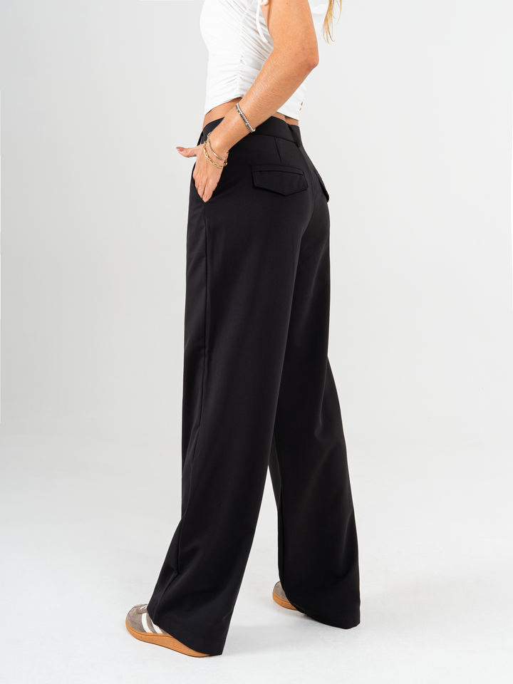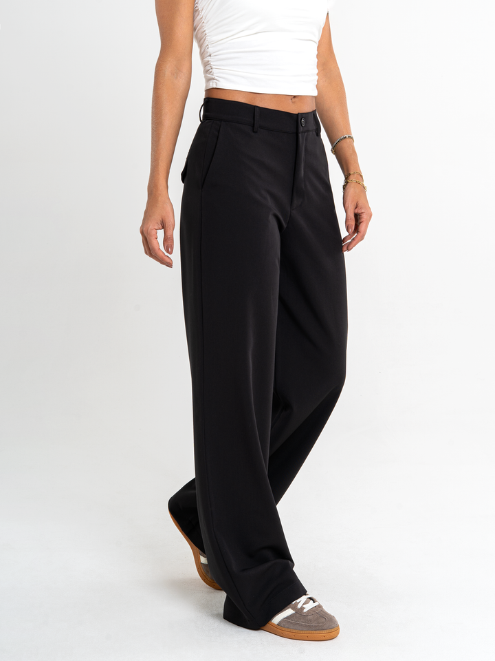 Pantalón straight leg, stretch, tono negro, tiro alto, tejido plano liviano, bolsillo tapas, silueta amplia.